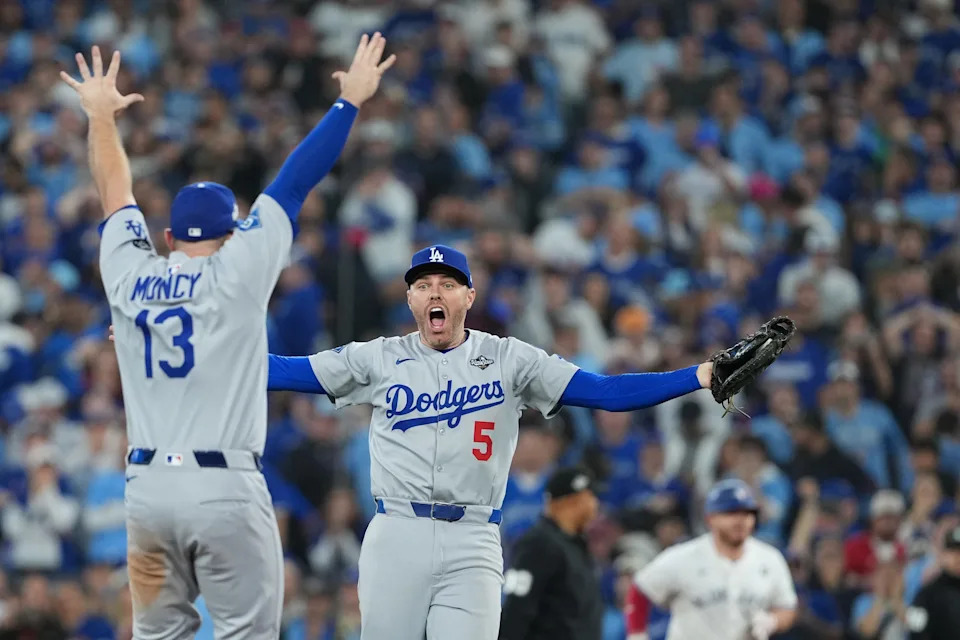 Freddie Freeman (5) and the Los Angeles Dodgers celebrate after defeating the Toronto Blue Jays in Game 7.