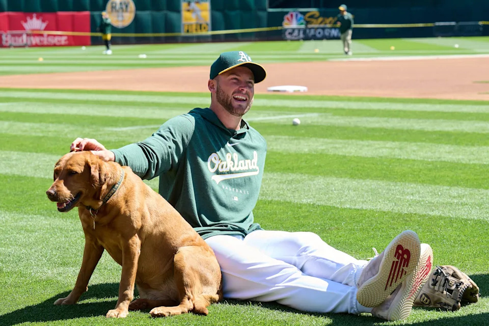 May 5, 2024: Oakland Athletics infielder Max Schuemann shares a moment with Reba, the Oakland Athletics’ clubhouse dog, before a game against the Miami Marlins at Oakland-Alameda County Coliseum.