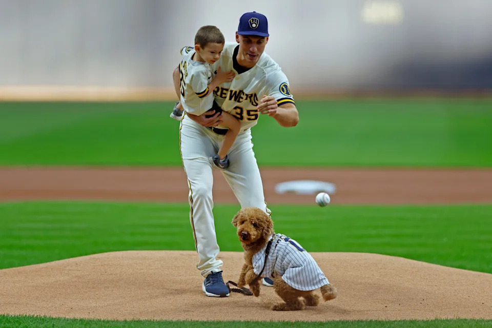 June 7, 2022: Milwaukee Brewers pitcher Brent Suter throws out a first pitch for his dog on Bark at the Park night prior to the game against the Philadelphia Phillies at American Family Field. Suter wrote a children’s book “The Binky Bandit” inspired by his mini golden doodle.