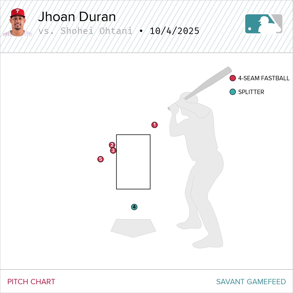 Waiting for Ohtani vs. Jhoan Duran, the hope was that it would be in a situation in which the Phillies were ahead and the outcome of the individual matchup would determine the game’s outcome. Here, we have two outs and Duran is simply on to keep the game close enough for the rally to occur. Instead, we see a pitcher trying his hardest not to let the best hitter in the game being played extend the score past what it already is. Duran looks like he is pitching around Ohtani a bit and that’s understandable.