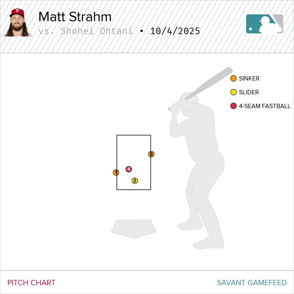 Last season, when the Dodgers came to Philadelphia to play a mid July series, the team also had a plan against Ohtani that they also executed well. At that time, I went through each at bat and looked at how they ended up being so successful against him, trying to find some kind of secret sauce that was being cooked up to get him out. The biggest takeaway is that the Phillies’ pitchers were just very, very good then as they were now. Still, it’s interesting to go back into the NLDS and see just how the team was able to craft and execute such a plan against Ohtani and if it can be replicated in the future. What I wanted to do was go through each game, all four of them, and see if there is something that they picked up on, a pattern, a weakness, that they exploited over and over again to the detriment (but not ultimate demise) of the Dodgers. Let’s start.