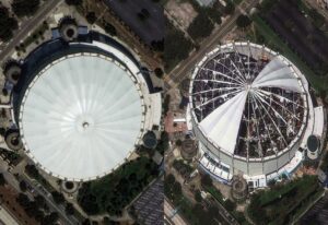 Tropicana Field before and after Hurricane Milton. Credit: © Satellite image ©2024 Maxar Technologies / USA TODAY NETWORK via Imagn Images