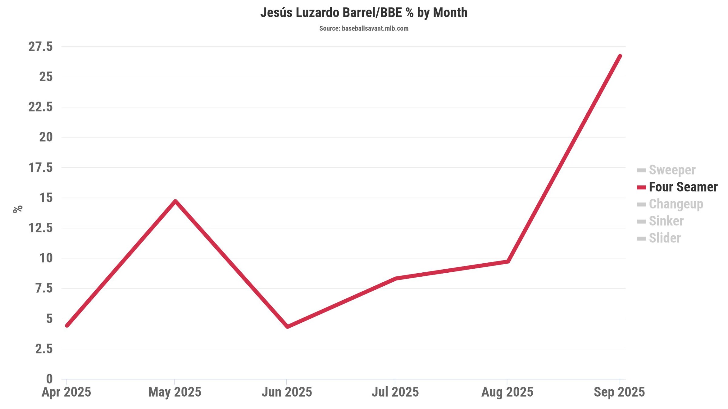 Of the two fastballs he throws, as the season progressed, he leaned more into the sinker and for good reason. Four seam fastballs have a tendency to get hit pretty hard when contact is made and for Luzardo, as the season wore on, batters were starting to barrel it a bit more.