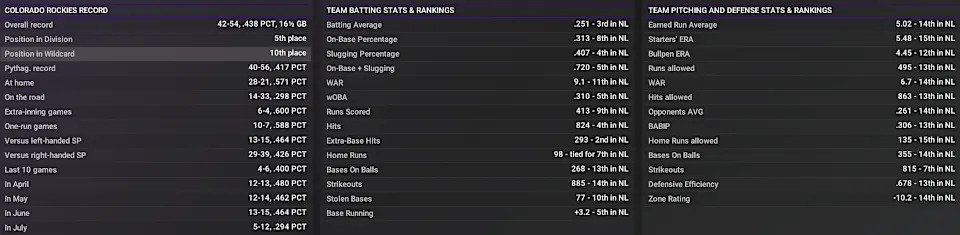 As you can see, offensively, the Rockies are much better across the board, aside from strikeouts and walks, which remain a problem. Though the offense truly is carried by Moniak and Goodman, there is more work to do there. Pitching remains at the bottom of the NL in every category.