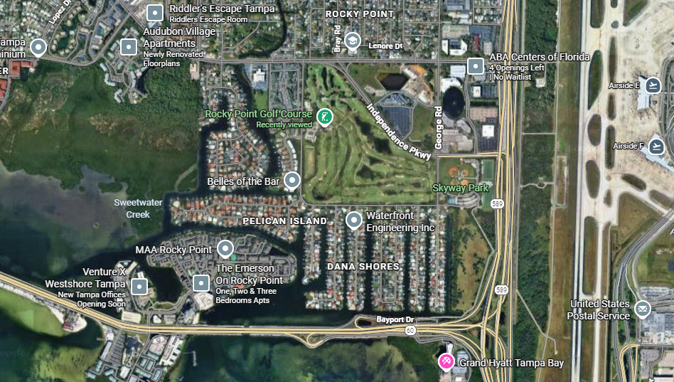 We will continue our practice of diving into the pros and cons and random musing of potential stadium locations, and today we are looking at a site near Tampa Bay and the Courtney Campbell Causeway, the current home of the Rocky Point Golf Course. This site was mentioned as a possible location here and here. (We’ve covered the other primary rumored site at Dale Mabry campus of Hillsborough Community College here).
