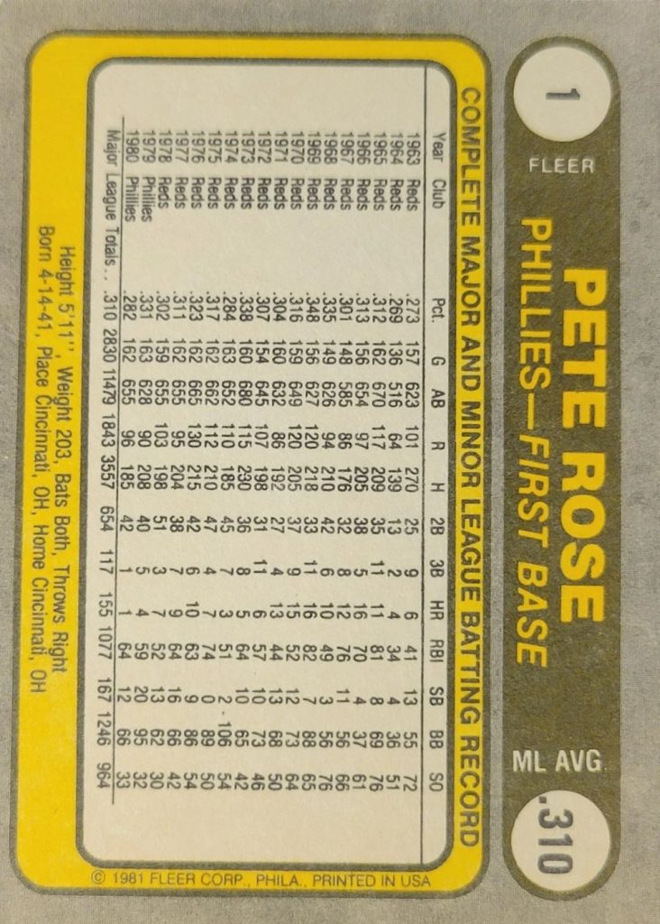 The Fleer #1 is a UER, a typo stating Rose collected 270 hits in ’63 instead of 170. The Donruss #371 Rose runs from around $1 in excellent condition to $6 raw; the same pricing values can be found for the Fleer #1. The Topps #180 values slightly higher, ranging from $1.25 to $10 mint.