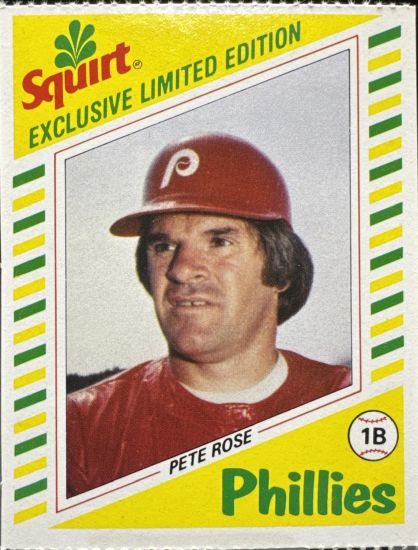 O-Pee-Chee released eight different cards featuring Rose in ’82 while Topps put out 10. Corporate marketing opportunities were everywhere at this point, from K-Mart and 7-11 to Squirt. The Squirt #12 Rose cards are not as valuable as Topps flagship for the year but can still bring in $2 to $5 depending on condition.