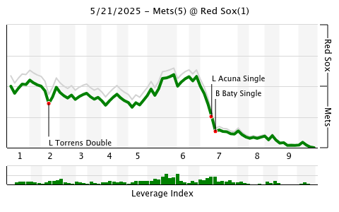Megill, to his credit, cruised into the fifth inning and looked better than he has in any of his May starts. He picked up a pair of strikeouts in the second and third and struck out the side in the fourth while working around a second inning double and a two-out single in the third. He rain into a lot of trouble in the fifth, however, and could not escape the frame. The inning began with a single from Nick Sogard. After Trevor Story was retired, Carlos Narváez singled and Ceddanne Rafaela was hit by a pitch. Jarren Duran strode to the plate and roped a Megill pitch deep to right field, just missing a grand slam and settling for a game-tying sacrifice fly. Megill was removed at that point, have allowed one run and struck out 10 batters in an encouraging start, despite only lasting 4 2⁄3 innings.