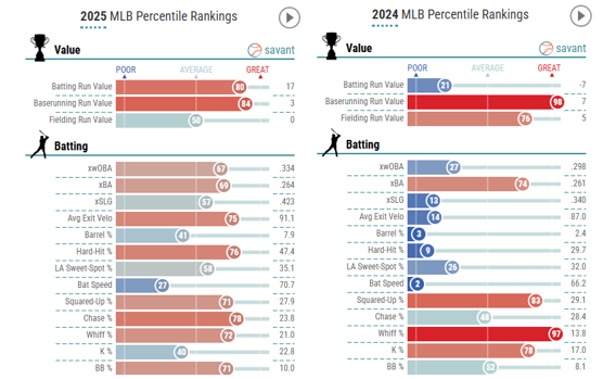 However, Turang became a really good hitter in 2025. He had a 124 WRC+ with 18 HRs to go along with his 24 SBs. His underlying metrics aren’t incredible, but they were a vast improvement across the board compared to his extremely blue 2024 Savant page.