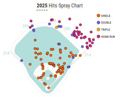 He should also provide good speed. Although he’s never stolen more than 23 bases in a minor league season, his 2025 major league pace, along with his 85th percentile sprint speed, should have him stealing 25-30 bases a season in due time.