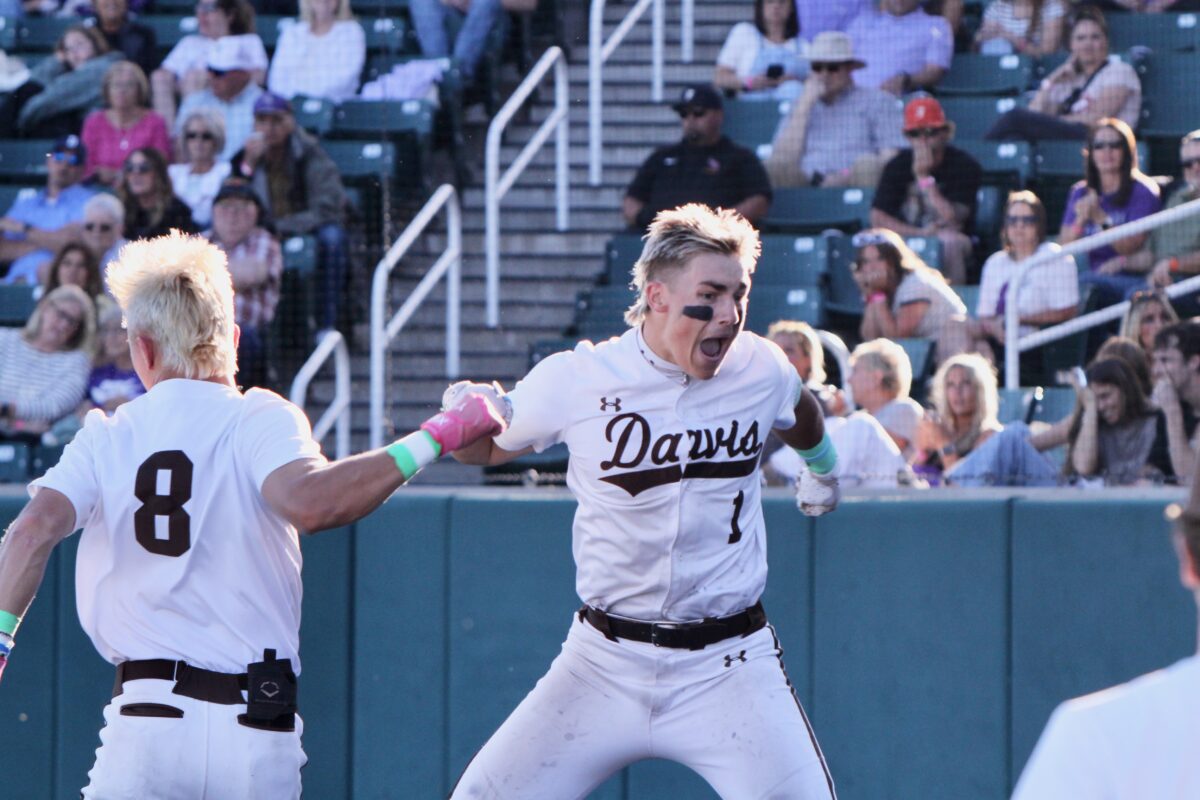 Davis High’s Jaxon Marble (8) and Owen Talbot (1) celebrate a home run during the 6A state baseball semifinals versus Lehi on Wednesday, May 21, 2025, at the UCCU Ballpark at Utah Valley University in Orem.