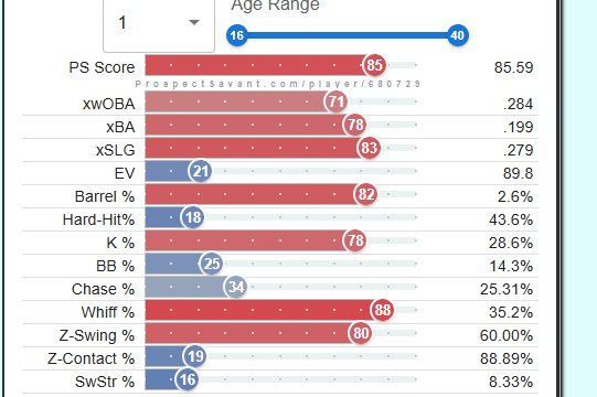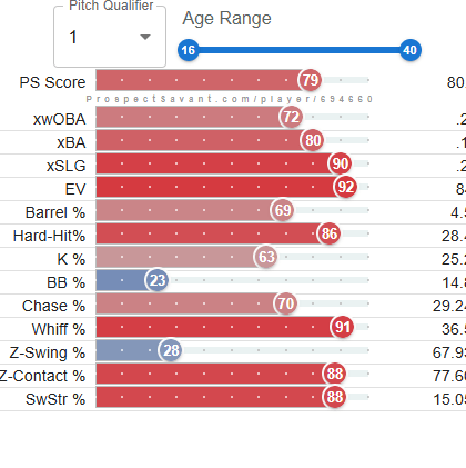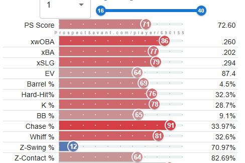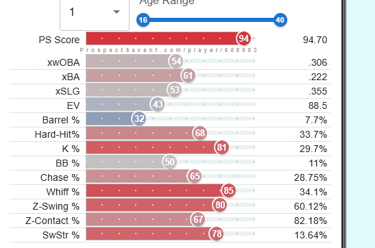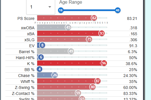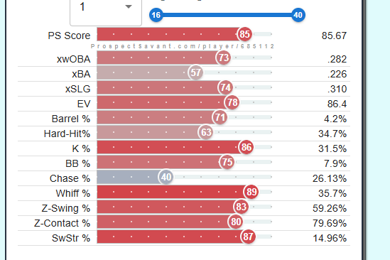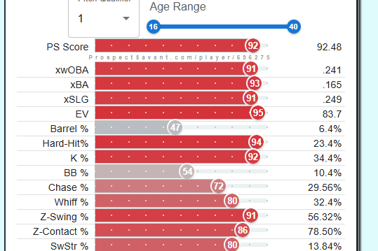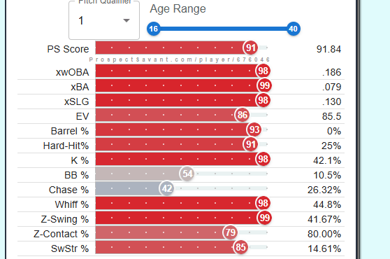 This year, the Cardinals will likely be looking for a similar opportunity to draft a young reliever to add to their growing stash of young arms. Fellow content creator, Tyler (@RedbirdFarmhands), and I combed through the minor leagues, and I have developed a list of 10 names who could be interesting fits for the Cardinals in 2026. Shout out to fellow content creator Kareem Haq for sharing with me https://prospectsavant.com, where you can get a visual of AAA and A ball players, where statcast metrics are measured and available. I will rank and tier these players based on their “PS score” – “PS (Prospect Savant) Score is a percentile stat that tries to evaluate prospect value. It weighs results, batted ball stats, and discipline (for hitters) multiplied by their age percentile (younger is better).”