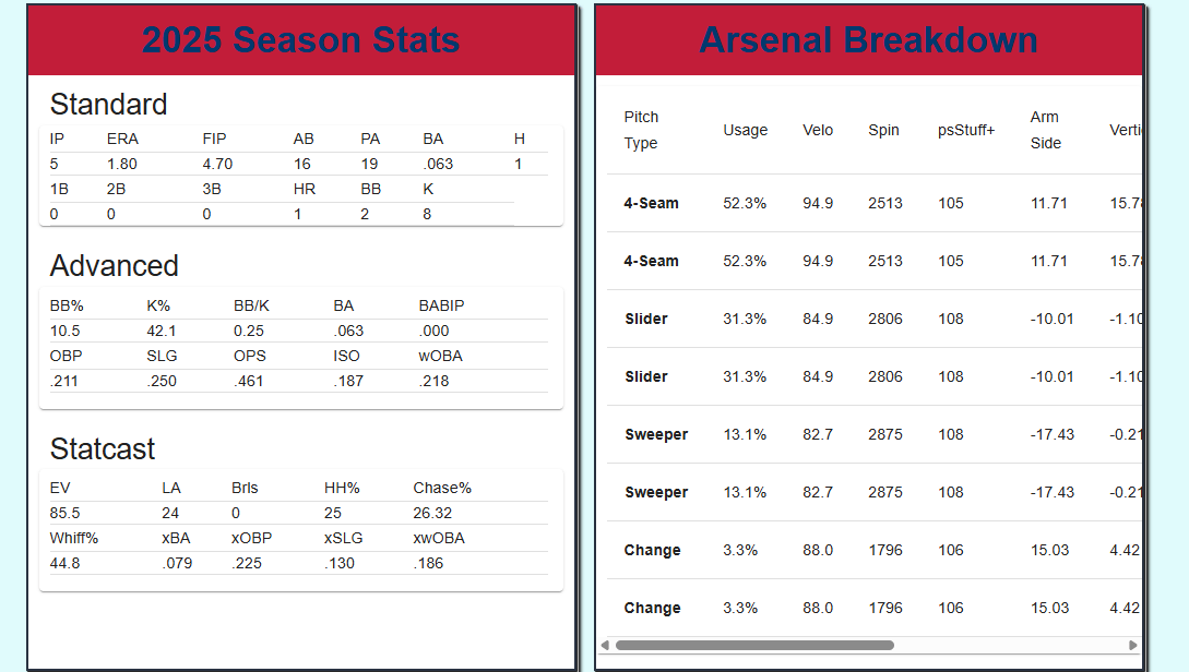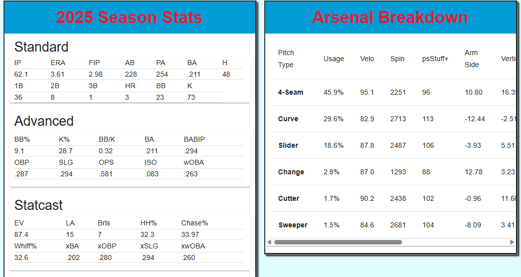 Forgive me, PS seems to have a slight bug with McGarry’s profile, but I still think sifting through the inconvenience is worth it to get a feel for McGarry’s usage and spin data. Once again, take these numbers with a grain of salt, as this was all that was produced at the AAA level in 2025. The Philly right-hander struck out 103 batters in 72 IP for Double A Reading this season, and walks were a little high, but out to the bullpen, you can live with that, posting a 3.24 ERA over that span as well. McGarry has the arm talent to potentially close games at the big league level. Mid-90s fastball with good carry and life at the top of the zone, two distinct breaking balls with high spin that should give him enough juice to really give hitters fits.