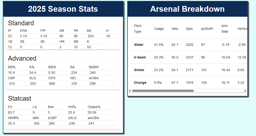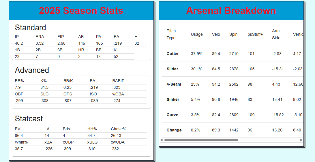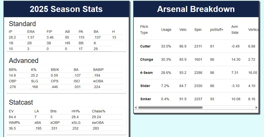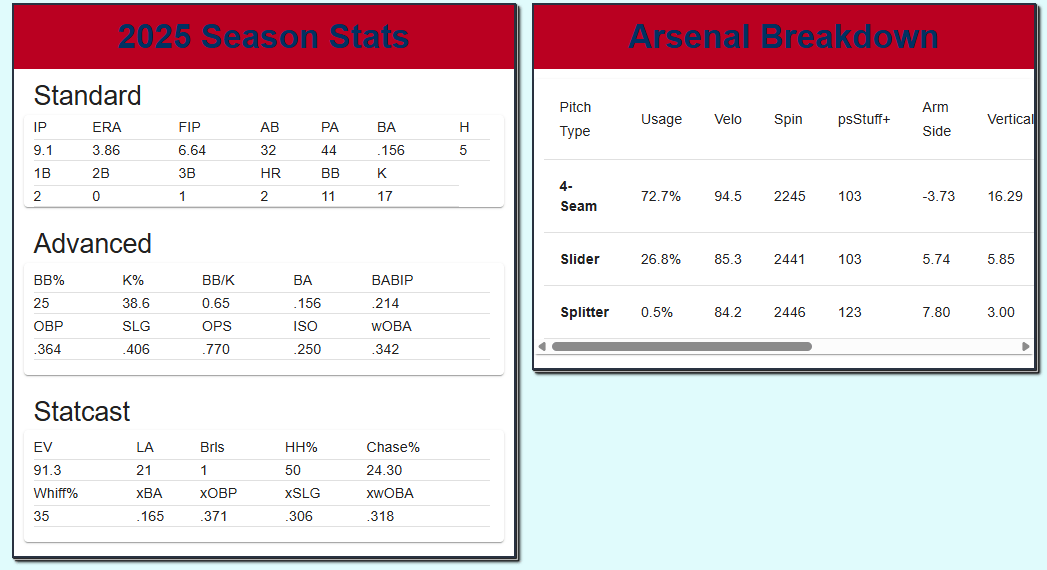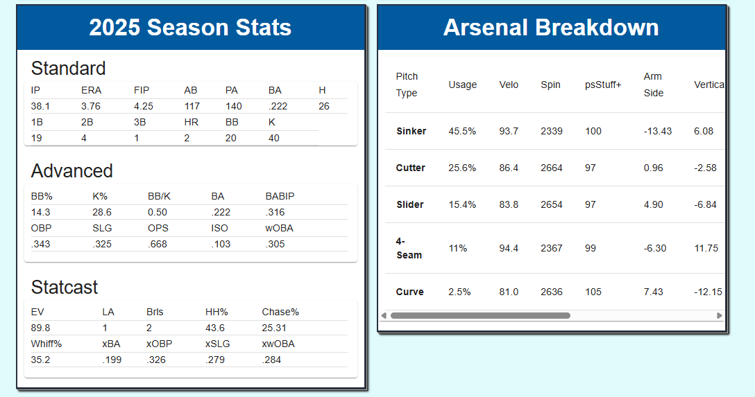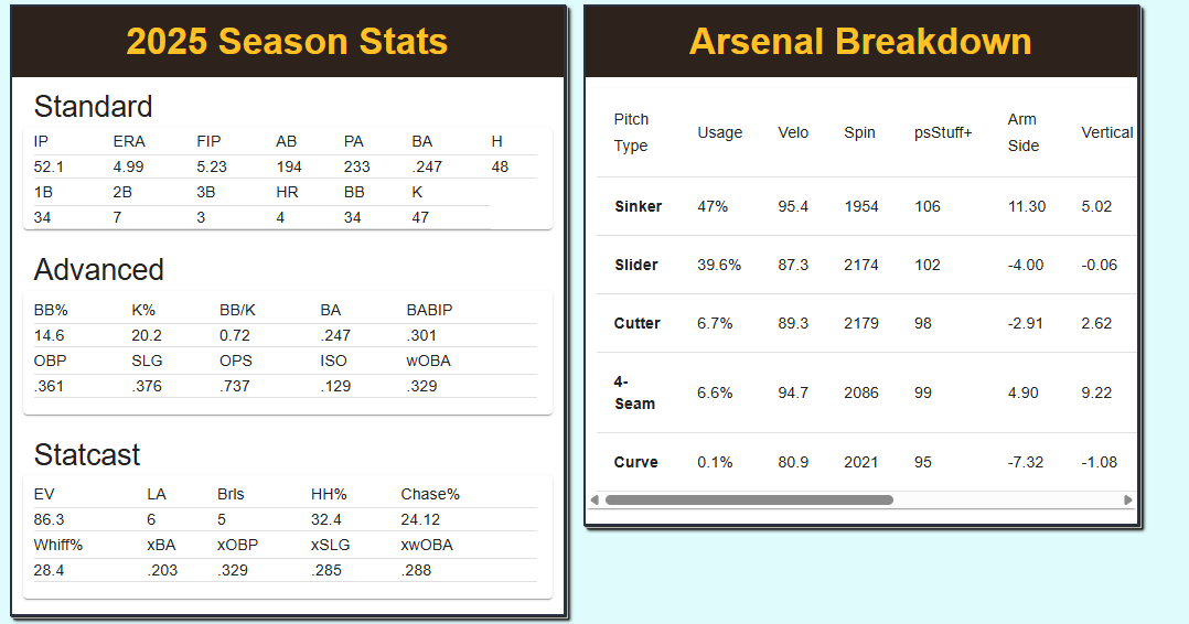 Southard throws 84% fastballs, but the trick is trying to figure out which one, and the ability to keep opposing hitters off balance and generate weak contact or suboptimal contact can work well in 1-2 inning bursts, all while having a put-away breaking ball that generated almost a 39% whiff rate. Southard might not set the world on fire at the next level, but could be a solid contributor to a bullpen in 2026.