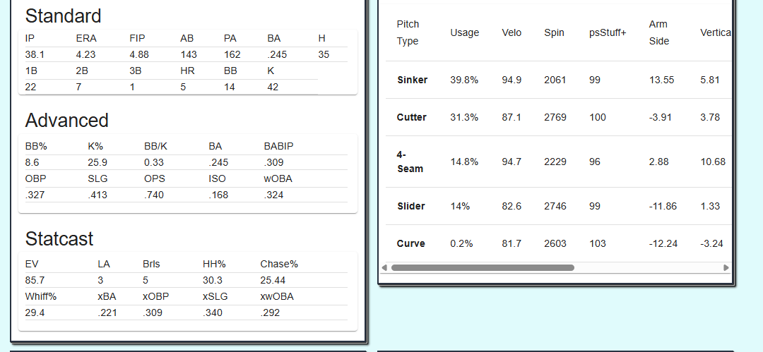 McCambley can spin it! 3 pitches that register above 2700 RPM between his Cutter, Slider, and Curveball, and a 4SFB that can sit mid 90’s combined with a whiff% of 35.7 McCambley looks like a weapon waiting to happen!