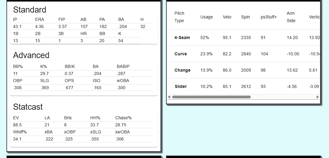 Cohen, a career reliever in MILB, is a soft contact merchant, as evidenced by his 84.4 MPH average exit velocity, and does a decent job at generating swing and miss, producing a 36.5 Whiff%. Cohen won’t wow you with big pure stuff, but can get the job done.