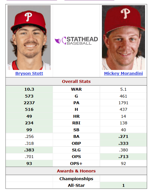 At this point, I feel confident in saying Stott has been the better player compared to Morandini and will probably end up with a better Phillies career when it’s all said and done.
