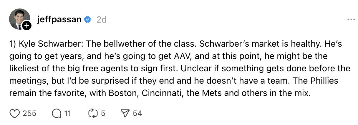 But in a post on Threads over the weekend, ESPN’s Jeff Passan suggested there could be a resolution to the Schwarber sweepstakes in the not-so-distant future: