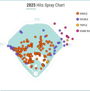 Compared to the 2025 Rockies, Arráez would have led the team in AVG by a good margin and also would have finished second in OBP just behind Tyler Freeman (for more on OBP check out Renee Dechert’s Rockpile from Tuesday). He also had 31 more hits than Hunter Goodman. What comes up as the biggest reason for him to sign with the Rockies is the team’s notable strikeout problems.