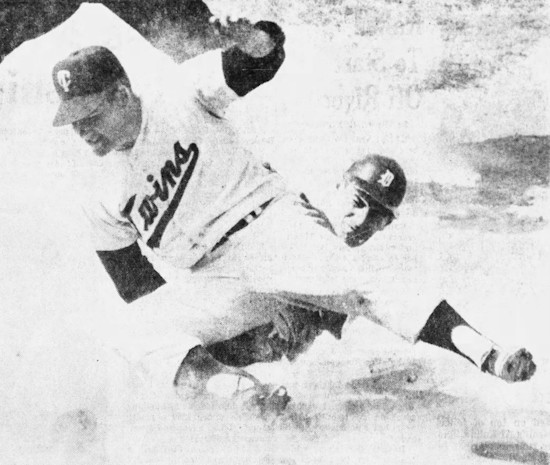 Pleis attempts to stop Detroit’s Dick McAuliffe from scoring after a wild pitch in a spring training game. Source: The Tampa Tribune, March 13, 1966.