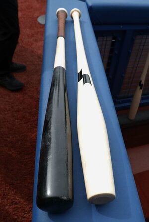 Photo taken on April 11, 2025, at Yokohama Stadium in Yokohama near Tokyo shows a so-called torpedo bat (R) and a conventional bat. Nippon Professional Baseball notified its 12 clubs the same day that players can use the torpedo-shaped bats in regular-season games. (Kyodo)Â