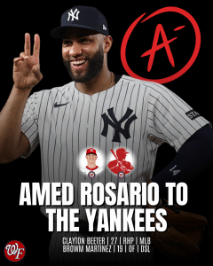 After the season the Nats signed infielder Orelvis Martinez as a minor league free agent and MLB Pipeline placed him at No. 19. Martinez had originally signed with the Blue Jays for $3.5 million out of the Dominican Republic in 2018. He led the Minor Leagues with 86 home runs between the 2021 and 2023 seasons, topping out with 30 for Double-A New Hampshire in his age-20 season of 2022, and he pushed his way to the Majors for one game on June 21, 2024 after a solid start at Triple-A Buffalo. He was then suspended 80 games after testing positive for the banned substance Clomiphene and released on September 15 and signed a week later by the Nationals on a minor league deal. A no-risk signing at this point, but with that suspension, you have to be cautious.