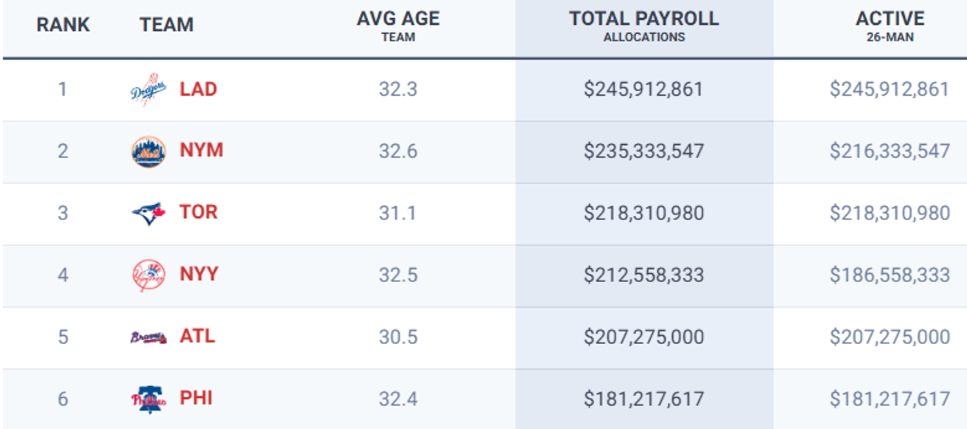 The Blue Jays currently have the second-highest 26-man payroll in the MLB at a jaw-dropping $218.3 million. Their total payroll allocations equal the same amount, which is third, only to the L.A. Dodgers and New York Mets.