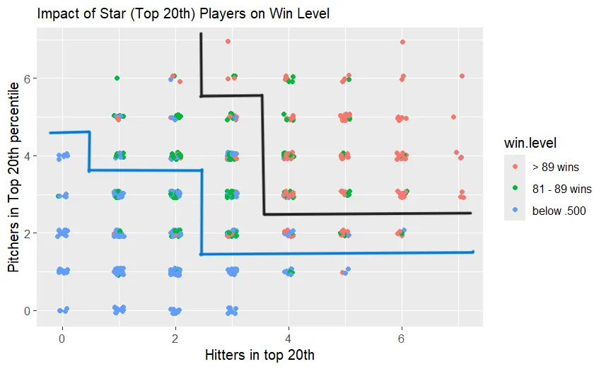 If you look at this closely, you can see that 3 “starZ” pitchers and 4 “starZ” hitters is the lowest combination that begins to result sustainably in 90 wins and playoff appearances. In this plot, teams need to target this as the absolute floor and work up and right in their roster construction exercise. Either direction seems to work, but the hitters direction has more room to mine. It’s really hard to get over 4 “starz” pitchers (due to innings constraints and the market place and injuries). It is more common to get above 4 “starZ” hitters.