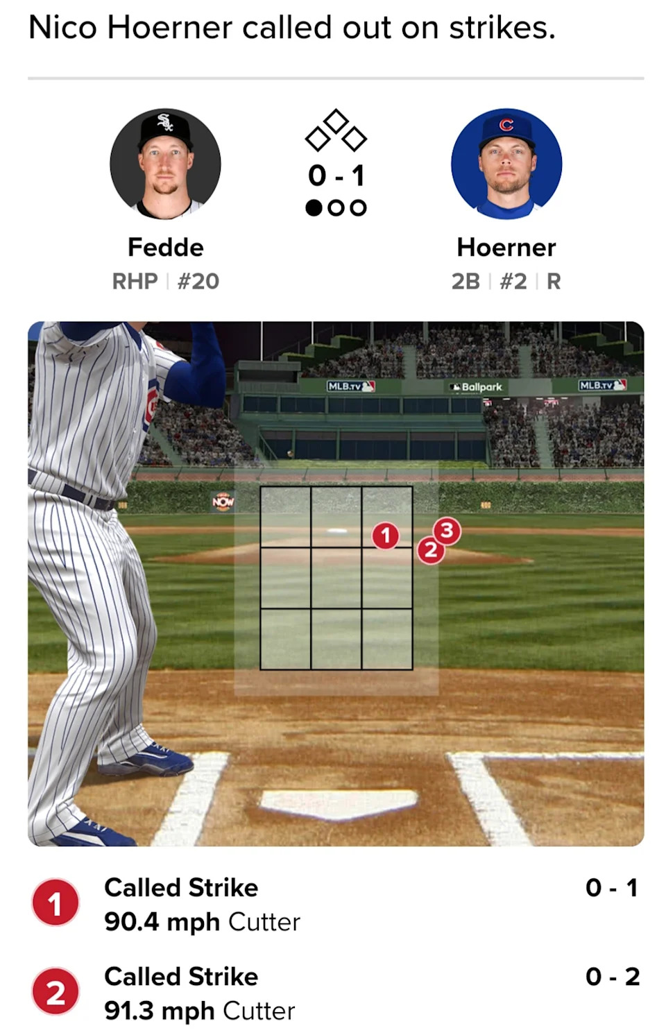 In the bottom of the fourth, we saw some egregiously bad umpiring with Hoerner at bat. He was called out on strikes on three straight pitches, only one of which was a strike: