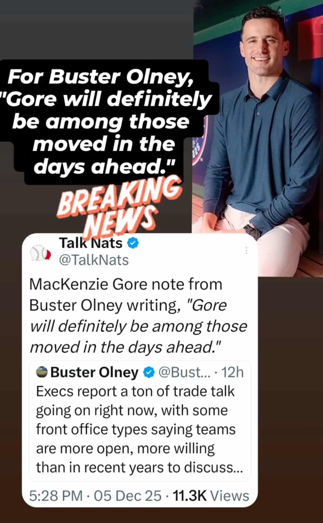 Our 2025 All-Star pitcher, MacKenzie Gore, could be gone in a matter of days if you trust Buster Olney’s latest writings. Reports have said that at least 15 teams are “in” on Gore. But Paul Toboni, the President of Baseball Operations, and certainly team principal owner Mark Lerner, would be weighing in on trading the Washington Nationals best trade chip.