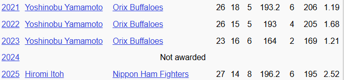 My favorite tidbit when looking at the Sawamura Award is that if the voters don’t think anyone is worthy of the award, they just … don’t hand it out at all, which happened last year.