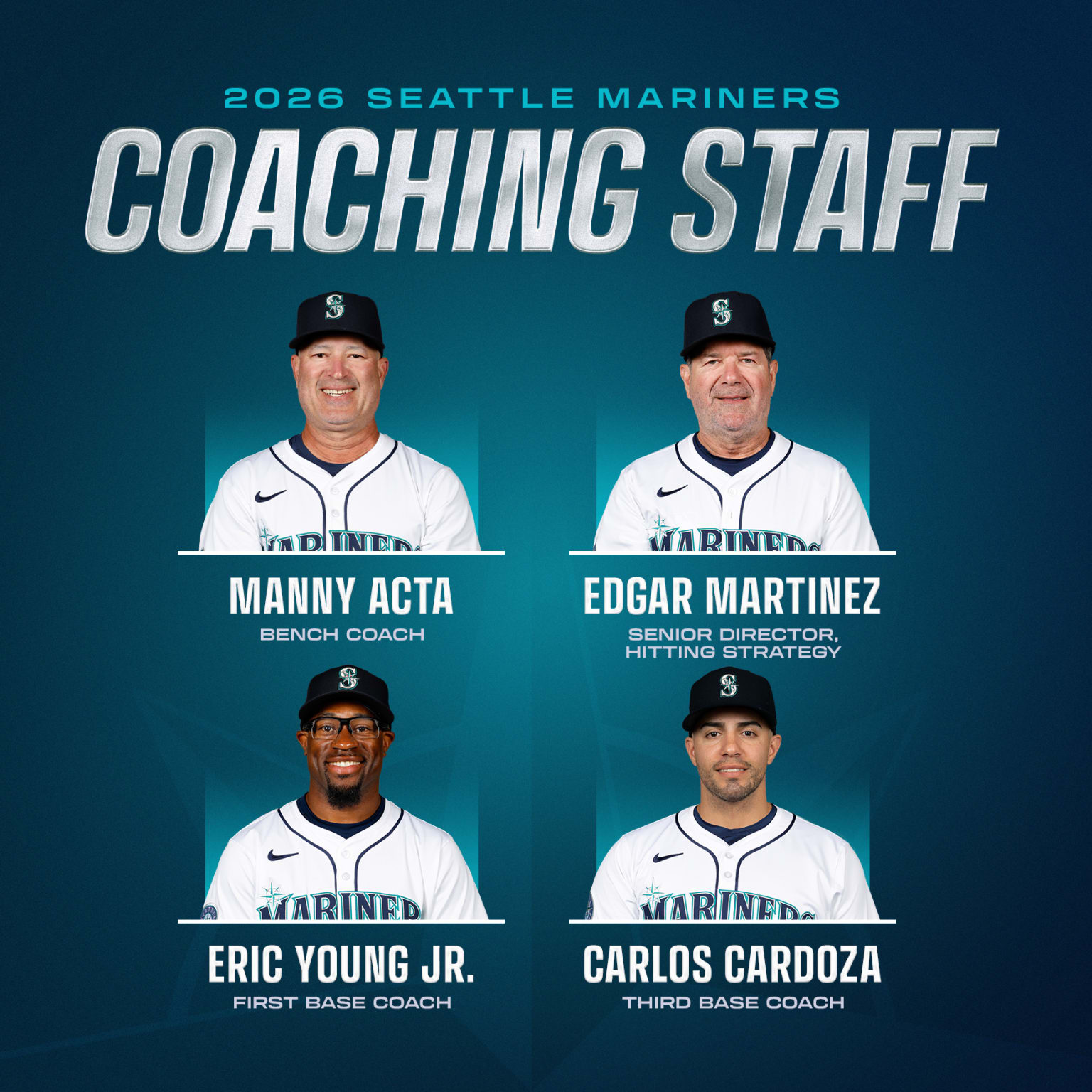 To replace the departing Kristopher Negrón, the Mariners bring in Carlos Cardoza as third base coach. This will be Cardoza’s first job on a major league roster, spending the previous 11 years within the Texas Rangers organization, most recently managing their Double-A affiliate, the Frisco RoughRiders. Cardoza managed the RoughRiders to their best record ever in 2024 and received the internal Texas Rangers Bobby Jones Player Development Man of the Year Award following the 2024 season.