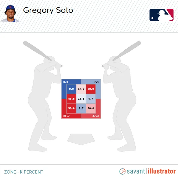 As shown here, most of Soto’s strikeouts come in the lower part of the zone or even below it, showing evidence he relies on his breaking balls to retire hitters.