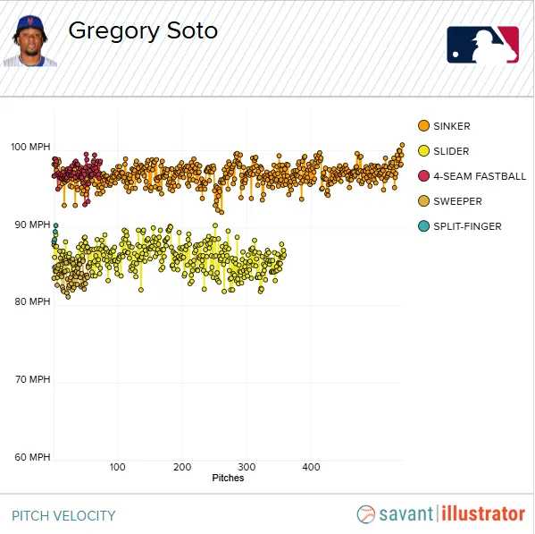 Soto uses a five-pitch mix primarily with a four-seam fastball and sinker as his high velocity pitches while using his three off-speed pitches to get swings and misses.