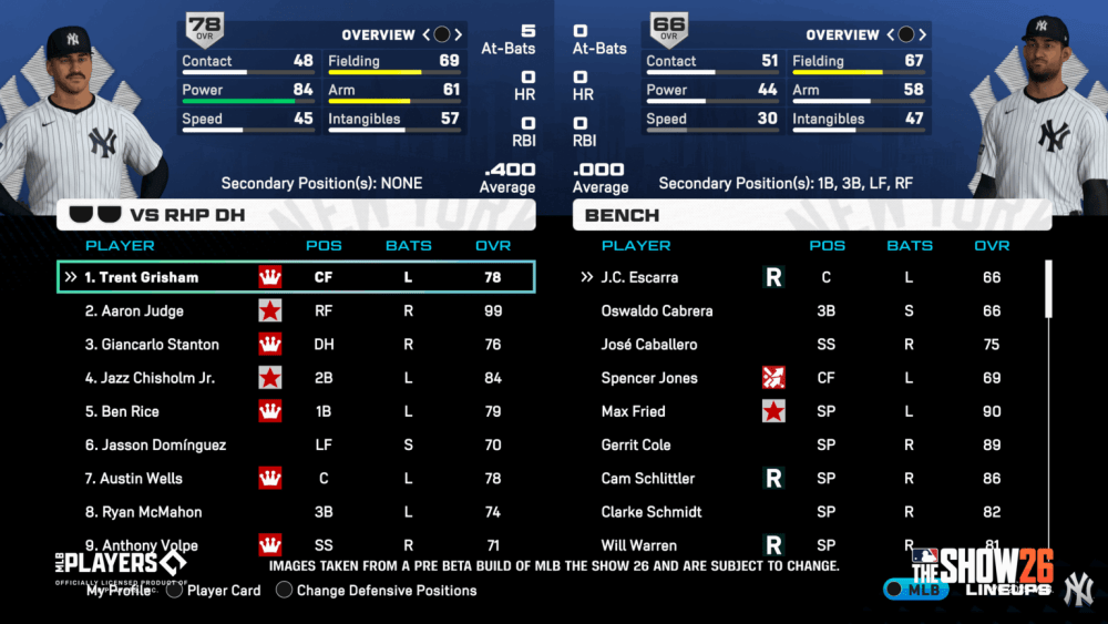 SDS shared early screenshots, comparing The Show 25‘s lineup AI with a work-in-progress The Show 26 version. And yeah, the difference is noticeable, should it be an actually AI-created lineup card.