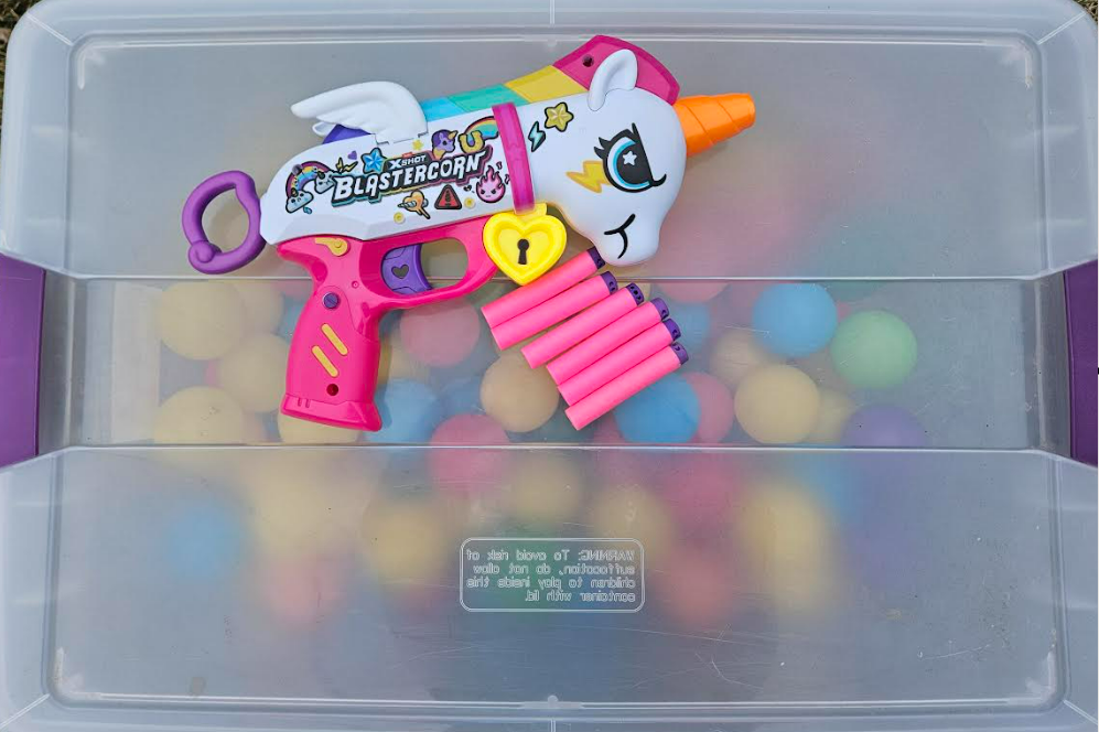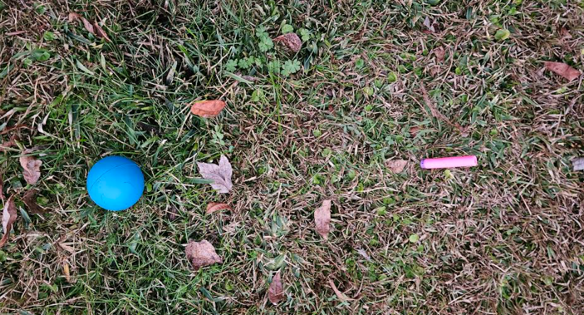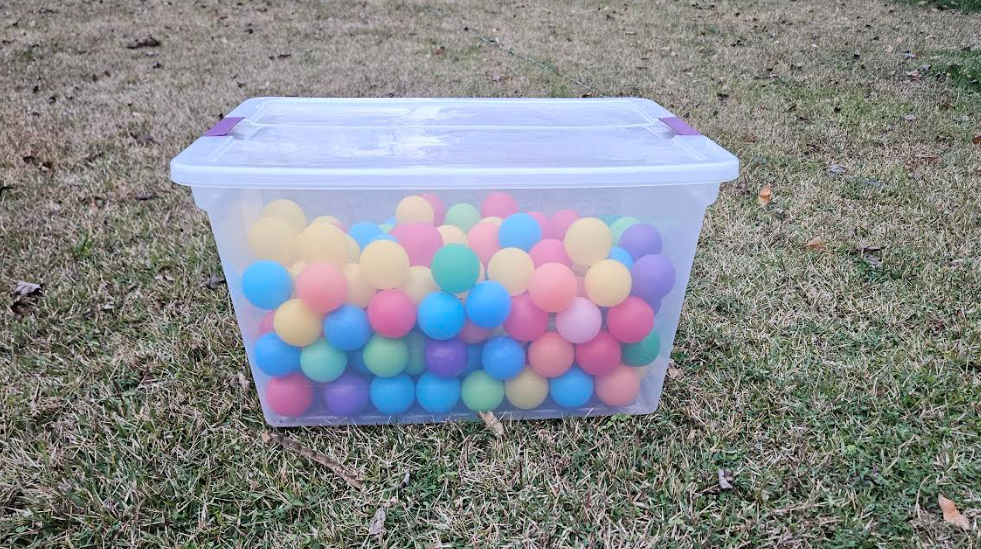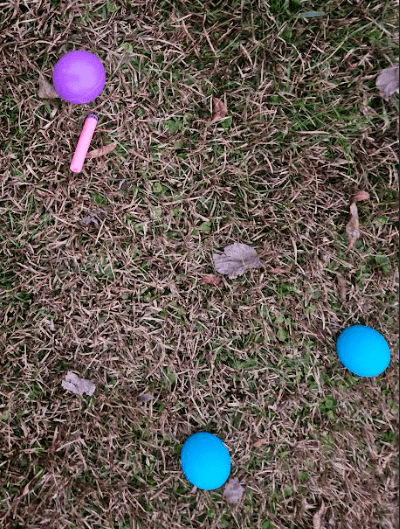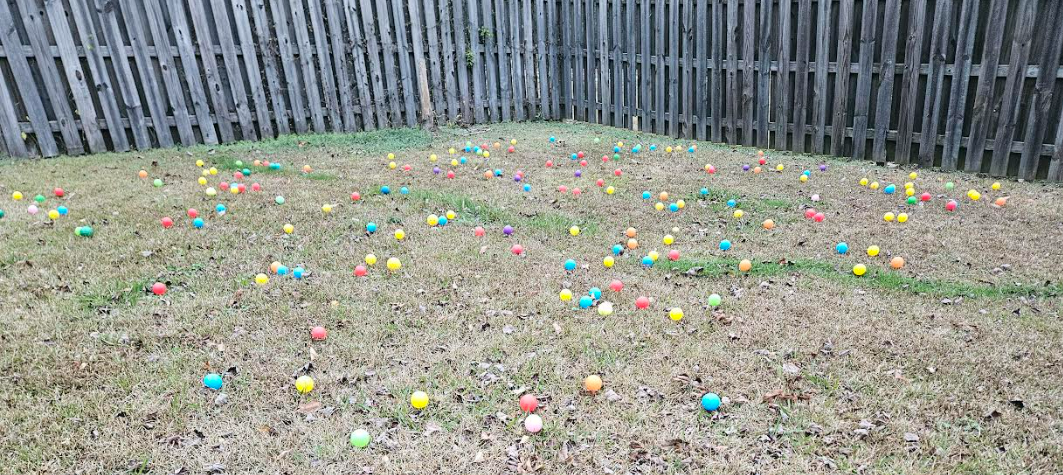 My kid fired pink and purple darts from the Blastercorn. She stood 40-70 feet away shooting darts in the general direction of the balls. If you’re concerned about the randomness of these events, it took her about 30 shots to get six of these anywhere near the balls. So let’s examine the results.