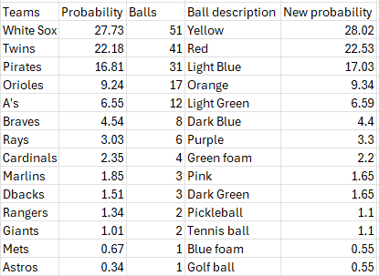 Now I don’t have 10,000 balls to make the math work out completely. It just feels like it. But then MLB’s math isn’t optimized either, per Ivan (because the percentages are insanely specific, yet they’re still drawing balls with sequences somehow. I bet they don’t have a big enough ball spinny thing for it to work.). So, I have assigned color and types of balls accordingly as laid out below. The lack of balls affects the probabilities, but it’s pretty close. The teams with the fewest balls have their odds warped the most. For example, the Mets have twice the MLB assigned odds as the Astros, yet each get one ball. I made up for this by giving the Mets a larger ball and the Astros a smaller one. The same happened with the Rangers and Giants.