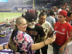 A baseball fan poses for a photo with Baxter the Bobcat, the Arizona Diamondbacks team mascot. Dbacks in Mexico © Daniel Gonzalez/The Republic