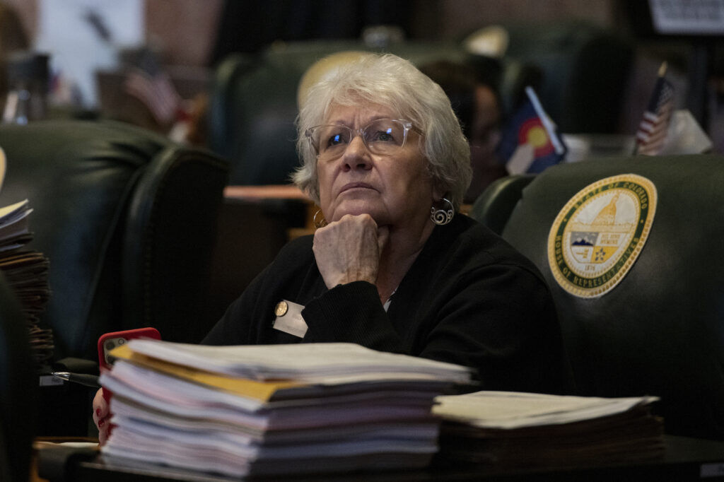 Colorado Rep. Mary Bradfield, R-Colorado Springs, listens at the state Capitol on Wednesday, May 7, 2025, in Denver. (AP Photo/Rachel Woolf)