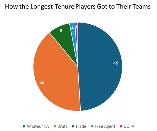 This makes sense, right? You’d expect amateur (international) free agents to lead the list, because they are predominantly signed younger. Then it’s drafted players. Then some trades, particularly young guys who were the prospect acquired in a trade for a veteran. Then free agents, which are rare because guys don’t usually reach free agency until they’re too old to spend 3,000 days with their new club. And then there’s one single undrafted free agent, because … well, there are very few UDFAs who ever do anything in baseball, that’s not how the game works.