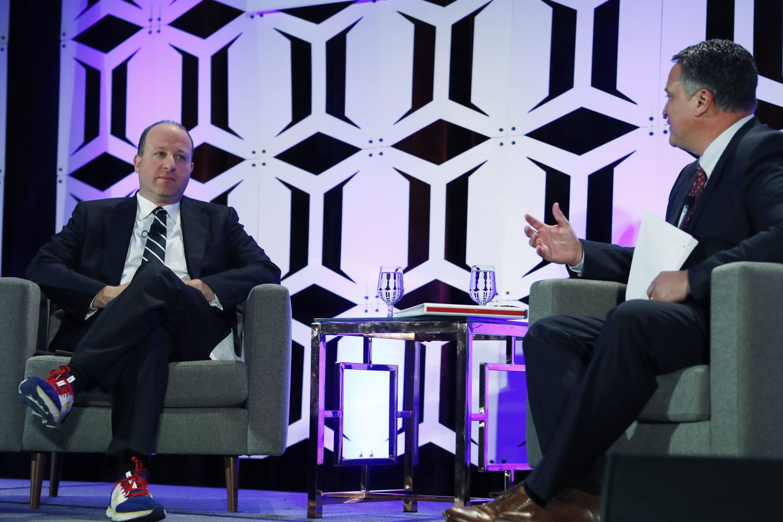 Colorado Gov. Jared Polis, left, considers a question from Dan Haley, president and chief executive officer of the Colorado Oil and Gas Association, during the governor’s appearance at The Energy Summit, which was hosted by the trade organization on Wednesday, Aug. 28, 2019, in Denver. Polis was questioned about new rules that he signed into law that increase regulations on the industry. (AP Photo/David Zalubowski)