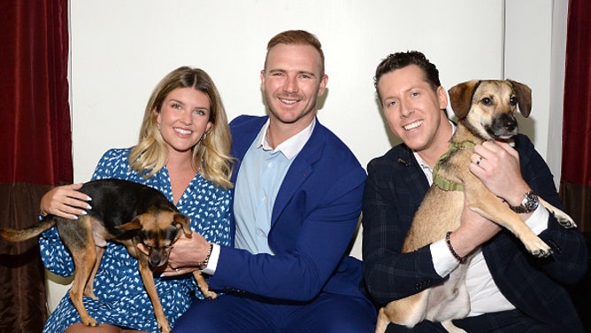 NEW YORK – (L-R) Haley Alonso, Pete Alonso and entertainment reporter Ryan Kristafer before a segment on “Good Day New York” to promote The Alonso Foundation’s association with BARK on August 13, 2024. (Photo by Michael Simon/Getty Images)