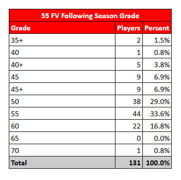There has been extensive research over the years on how players perform at the major league level relative to their prospect ranking. This research is trying to answer questions like “How much WAR should we expect from a pitcher given a 50 FV ranking over the first six years of their big league career?” I would like to dig into this data more in the future, but today I am going to focus on the year-over-year change in a player’s grade prior to making a major league debut and exhausting their rookie eligibility. How often does a player make a jump like Wood or Bichette? How many Quinn Matthews would we need in our system to expect to have one breakout every year?