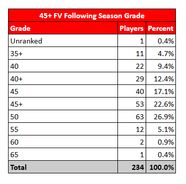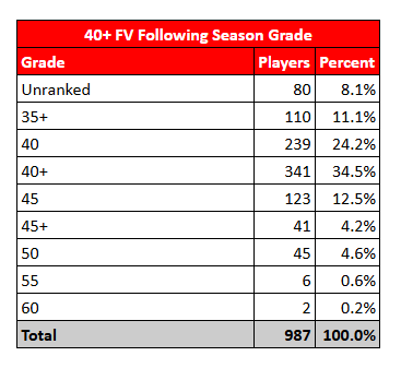 Below we will walk through the historical ranking trends of prospects by FV bucket. I am including the graduation rate for reference, but a prospect graduating is not included in the table summary. The FV ranking in the table is for the next season only, not their final prospect grade before graduating. One final note, I do not necessarily agree with all of the Fangraphs grades, but to stay consistent, I am showing how Fangraphs has the current crop of Cardinals prospects ranked. If it were my grades, we would be creating a new tier for Rainiel Rodriguez!