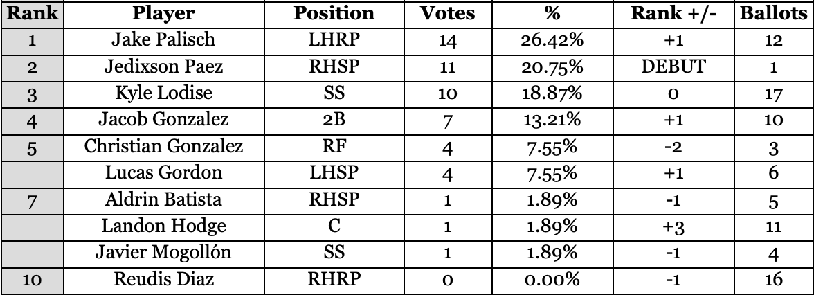 As voting winnows, it is likely that smaller margins will determine winners, which in turn will extend voting times longer. With roughly six weeks left in our voting period we still aim to get to at least 40 ballots, but that is hard to guarantee at the moment. After a good sampling of voters, Jake Palisch emerged as the victor — just our second relief pitcher and first southpaw reliever. (With the loss of Peyton Pallette to the Guardians, Palisch is the sole remaining reliever to advance so far. The lefty earned 14 of 53 (26%) votes: