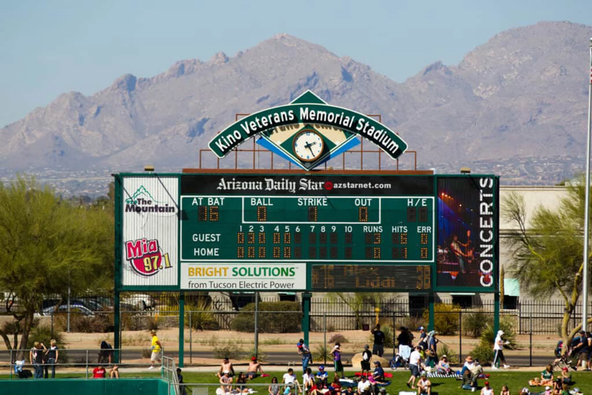 The Santa Catalina Mountains rise behind the scoreboard at Kino Veterans Memorial Stadium in Tucson, Arizona. Photo courtesy of Kino Sports Complex