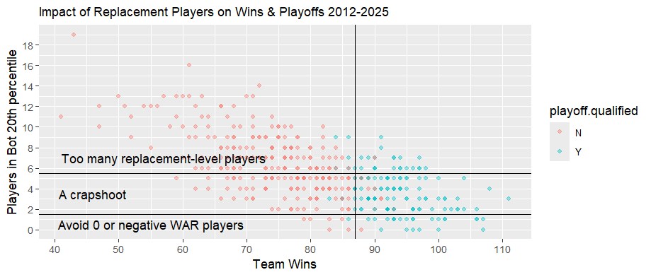 Notice the bottom right of the graph. Teams with zero or one replacement level player achieved win totals of 87 or more and made the playoffs quite a bit more reliably than everyone else.