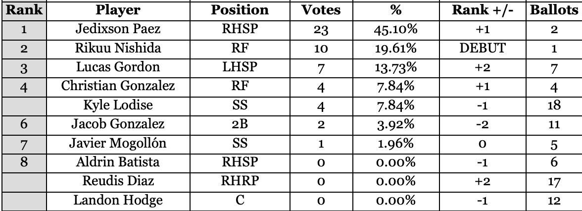 Paez advanced on just his second ballot. As a Rule 5 pick just about 10 days ago, he has never before appeared in our Prospect Vote.