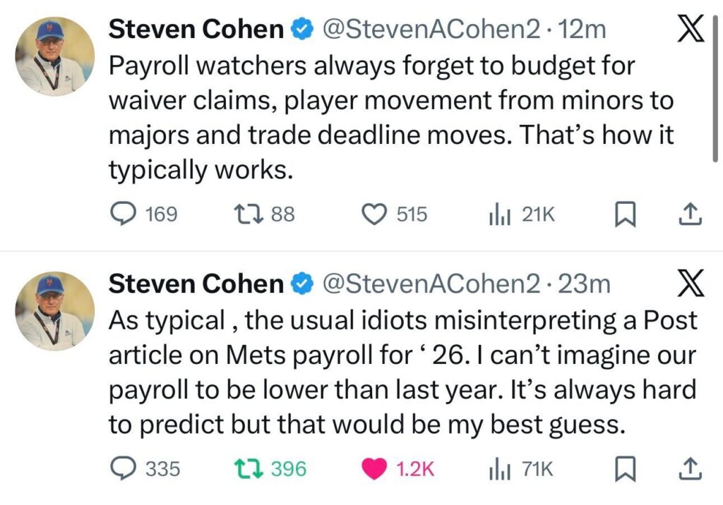 “As typical, the usual idiots misinterpreting a Post article on Mets payroll for ‘ 26,” Cohen wrote. “I can’t imagine our payroll to be lower than last year. It’s always hard to predict but that would be my best guess.”