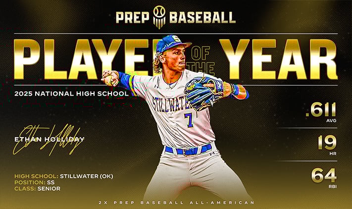 Towards the end of a high school career that featured plenty of buzz since the beginning, class of 2025 shortstop Ethan Holliday (OK) was crowned as Prep Baseball’s 2025 Player of the Year. The Oklahoma native became the third from the Sooner State to receive the award after Jackson Jobe (Heritage Hall HS) in 2021 and Ethan’s brother, Jackson Holliday (Stillwater HS) in 2022.